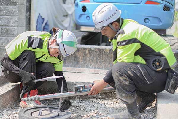 道路の仕上がりの高さより低かったら水が溜まったり、高かったら車が通った時に跳ねたりするので高さをシビアに計測します。